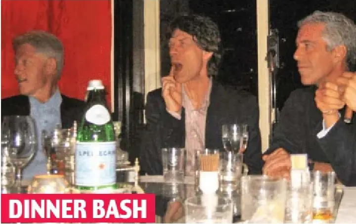 DINNER BASH Jun­ket: Mick Jag­ger sits between Bill Clin­ton and Epstein